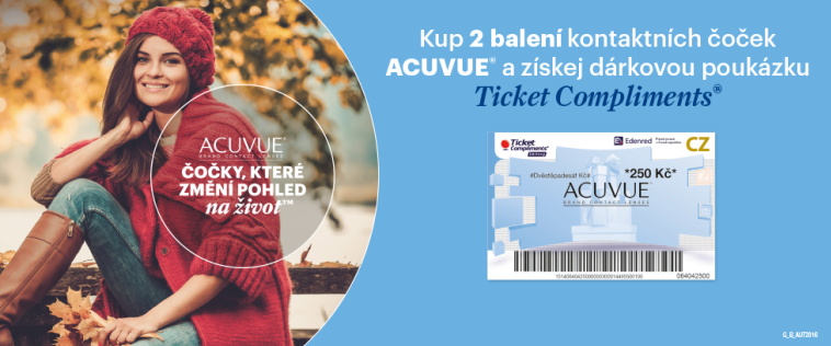 Značka Acuvue chce své fanoušky před Vánocemi obdarovat: K nákupu 2 balení čoček Acuvue vám proto na prodejně přidáme dárkovou poukázku Ticket Compliments v hodnotě 250 Kč, se kterou ušetříte na nákupu vánočních pochutin, oblečení, kosmetiky pod stromeček a dalšího.