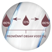Obsah vody v čočkách Dailies Total1 stoupá z 33% v jádře na více než 80% na povrchu až téměř ke 100% v nejpovrchnější vrstvě. Silikon-hydrogelový materiál v jádře umožňuje vynikající propustnost, výjimečně měkký hydrofilní materiál na povrchu poskytuje mimořádnou lubricitu.